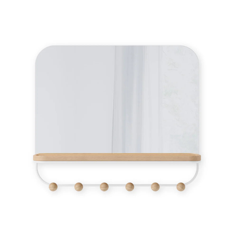 A mirror with integrated storage, Estique features six wooden hooks to protect items while adding a decorative touch. Its integrated tray is perfect to hold your phone, wallet, keys, candles and more, while its mirror provides functionality to touch-up before heading out the door. Its modern mix of wood and metal make it a decorative storage solution that will look great in any home or office space. Maximum capacity of 35 lbs. (16kg) including the hooks and tray. Measures 18 x 4 x 16' (46 x 10 x 41 cm). Sourced from renewable wood sources and made with an eco-friendlier finish. It produces 85% less water and solid waste than traditional electroplating finishes. Wood is a unique natural material with variations in tone, texture, and grain. The product may vary from our imagery.